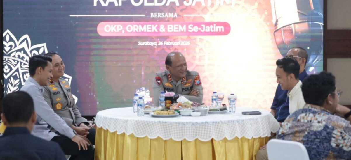 SURABAYA – Kapolda Jawa Timur, Irjen Pol Drs.Nanang Avianto, M.Si silaturahmi dan buka puasa bersama Badan Eksekutif Mahasiswa (BEM), Organisasi Mahasiswa Ekstra Kampus (Ormek) serta Organisasi Kemasyarakatan Pemuda (OKP) se-Jawa Timur di Selasar Gedung Patuh Mapolda Jatim, Selasa (23/2/2026). Kegiatan tersebut menjadi sarana mempererat hubungan antara Polda Jawa Timur dan…